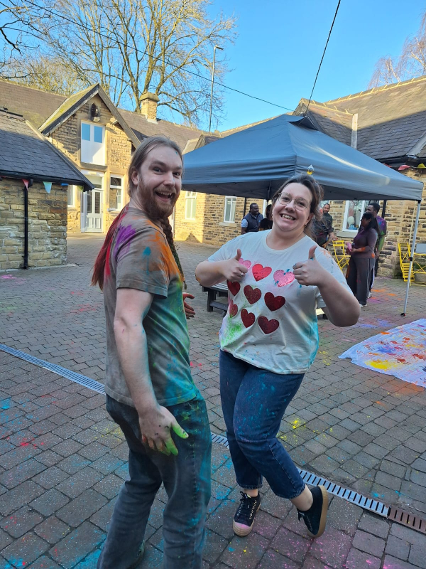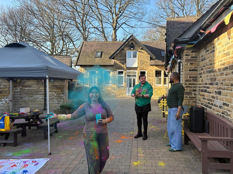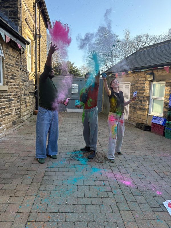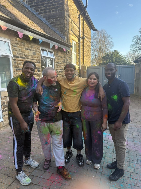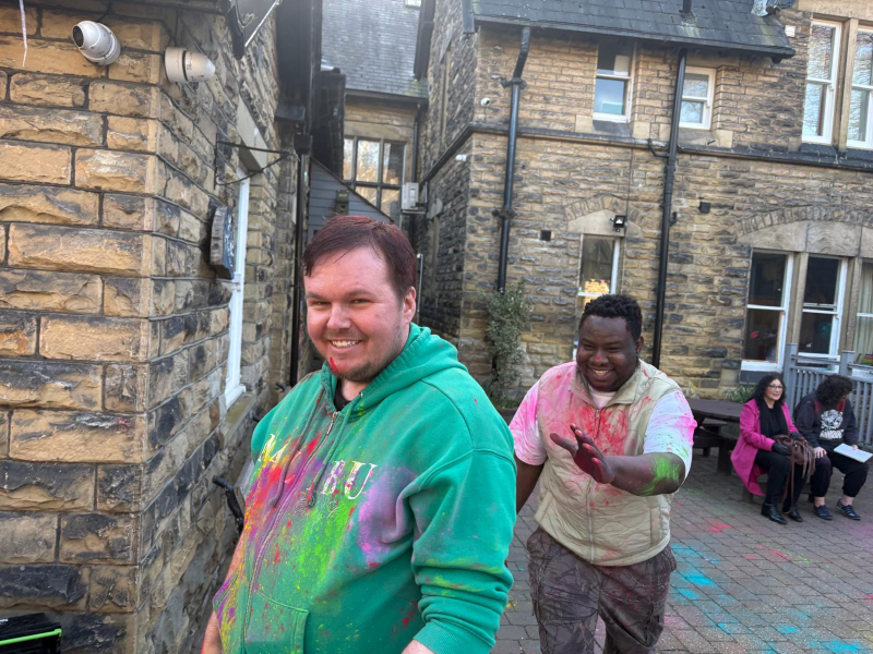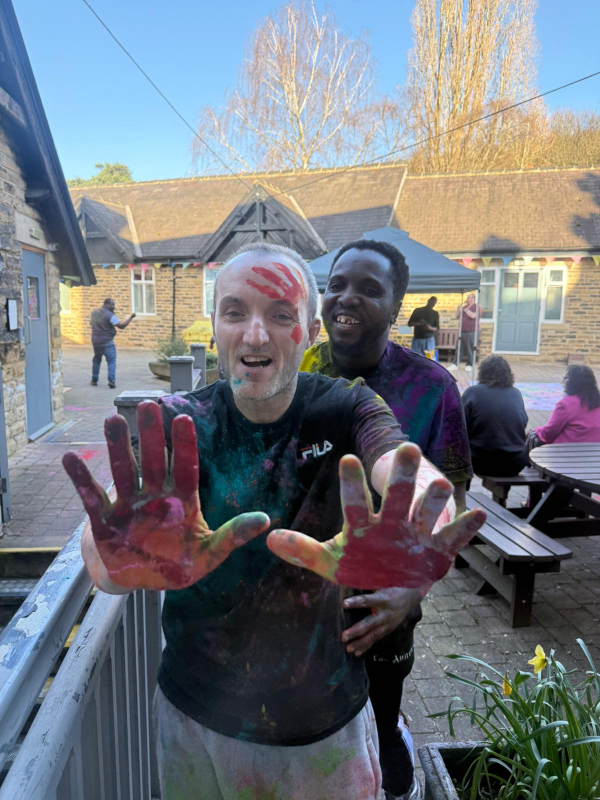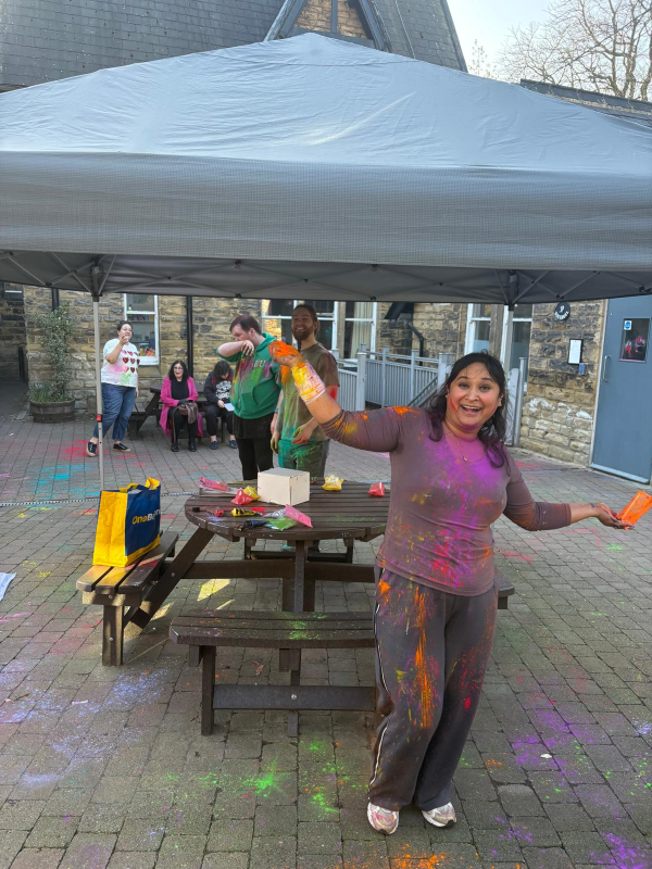 The homemade lunch included spiced patties, salads and bhajis, followed by traditional music, dancing and colourful powder throwing. Staff and service users also created a bright collage of handprints to commemorate the occasion.