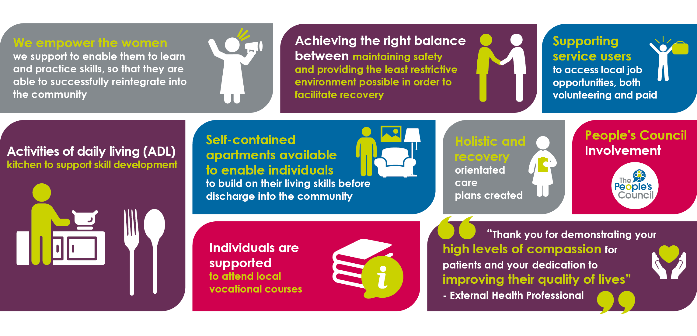 The service is also able to offer community rehabilitation (level 1) support in the step down flats on the hospital site.