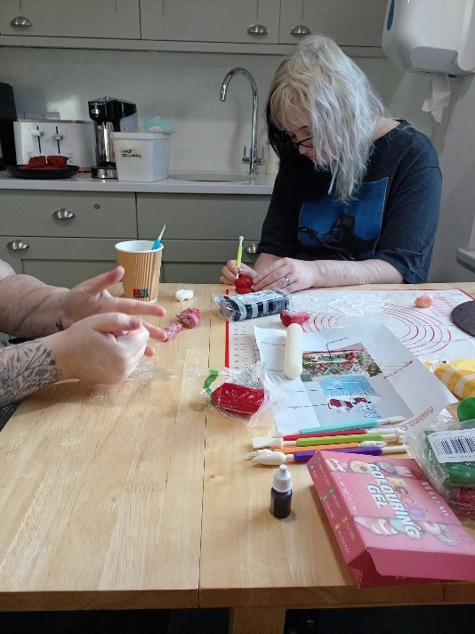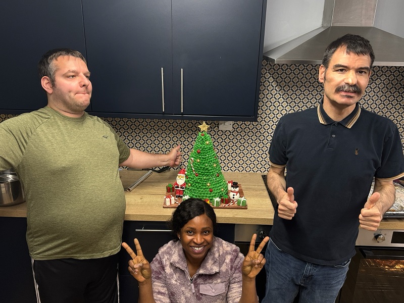 The people we support at Oaklands held a meeting, agreed on a winter town theme, then headed to the supermarket together to buy ingredients before singing along to Christmas songs while they baked.