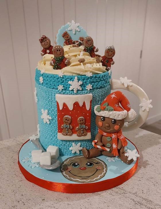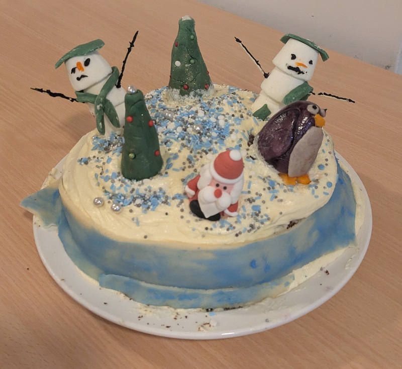 Responsible Officer Assistant Becky produced a hot-chocolate-inspired chocolate cake with gingerbread-style fondant figures and cable-knit icing detail. Judges praised the craftsmanship and cosy concept.